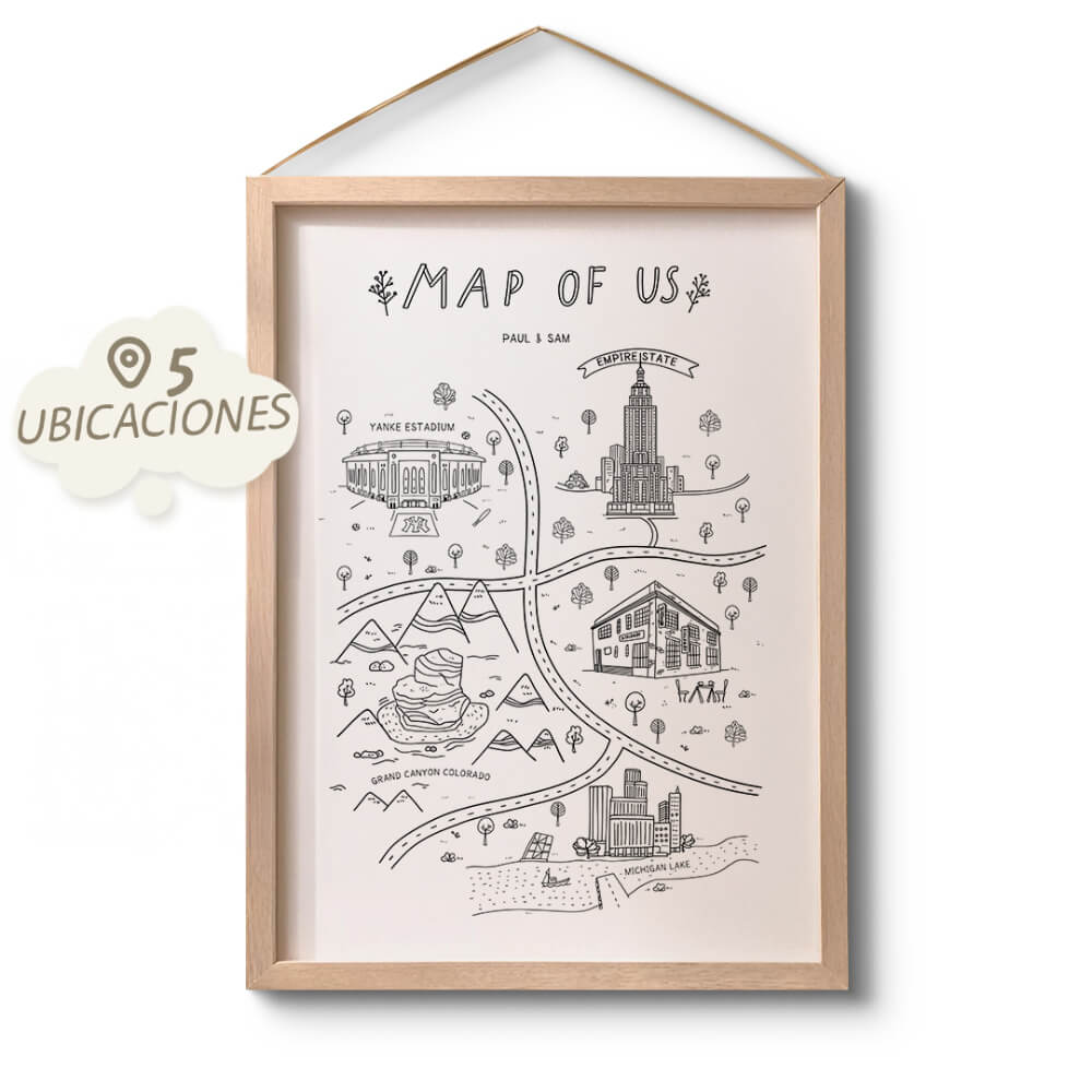 Tras completar tu compra, recibirás un formulario detallado para indicarnos toda la información necesaria para crear tu mapa: lugares, nombres, personas, mascotas y cualquier otro detalle que quieras incluir.